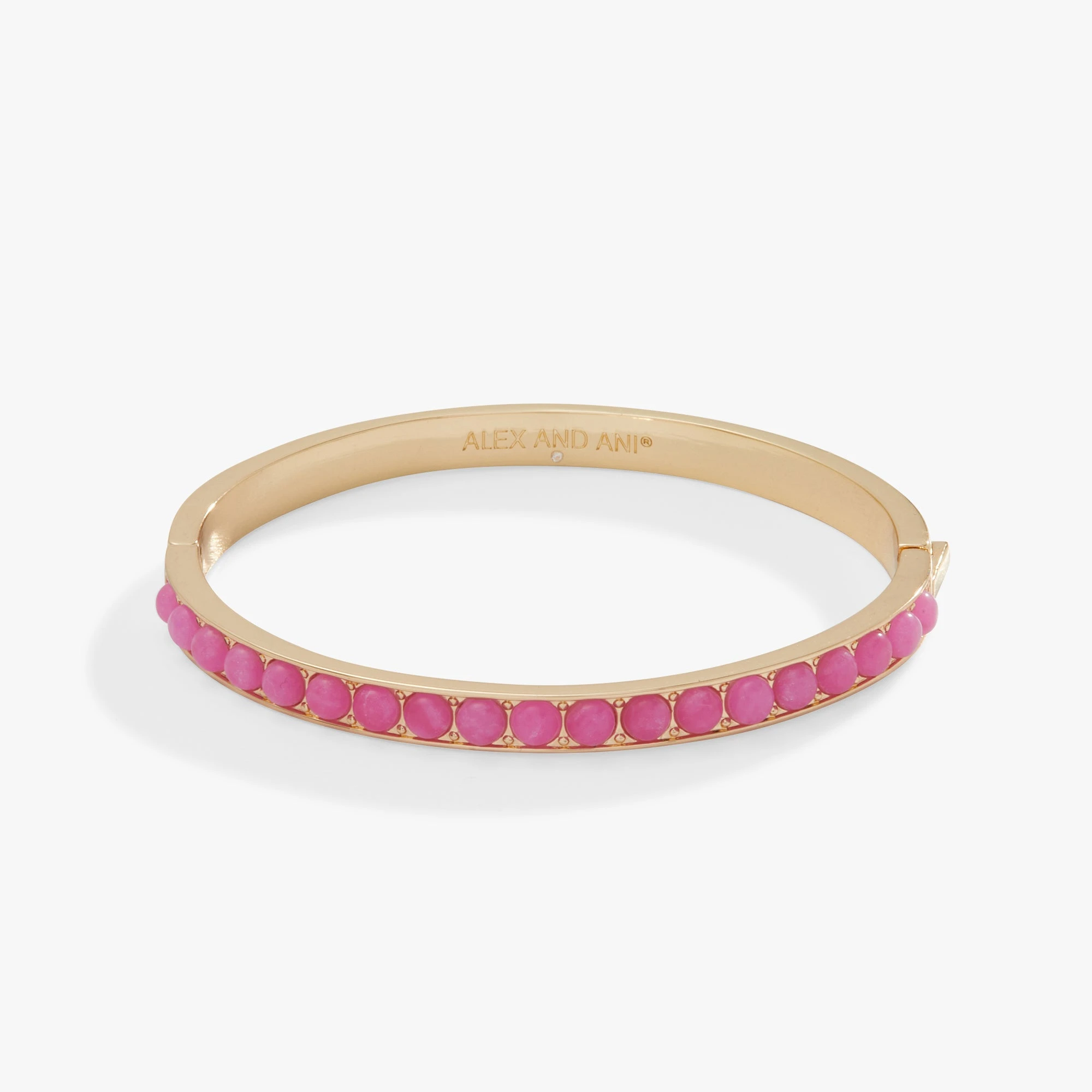 This Gemstone Hinge Bangle is the perfect color pop statement piece. The gold finish is accentuated with richly-colored reconstituted pink agate stones for an elegant yet understated look. With its easy to take on and off hinge design, this bracelet is the perfect everyday accessory for your wardrobe.